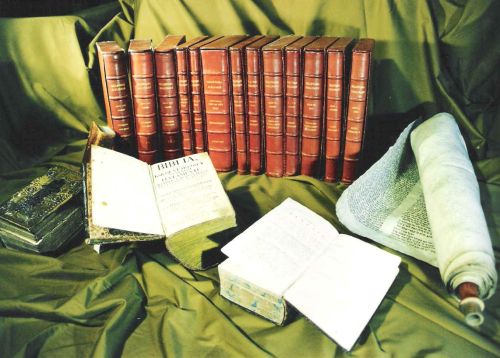 Na pierwszym planie Biblia hebrajska: Biblia hebraica secundum editiones Athie, Ioannis Leusden, Simonis Aliorumque, Lipsiae 1839. Obok zwój pergaminu w języku hebrajskim. W środku trzeci starodruk - otwarta Biblia ks. Jakuba Wujka: Biblia to jest Ksiegi Starego y Nowego Testamentu (...) z wykładem katholickim, trudnieyszych mieysc (...) przez Iakuba Wuyka, Wrocław 1740. W głębi widoczny 13-tomowy,