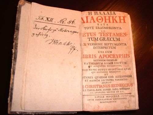 Czwarty starodruk to Stary Testament w języku greckim w wersji Septuaginty z księgami apokryficznymi (kopia egzemplarza edycji watykańskiej), Lipsk 1730: Vetus Testamentum graecum ex versione Septuaginta interpretum una cum libris apocryphis secundum exemplar Vaticanum Romae editum..., Lipsiae 1730